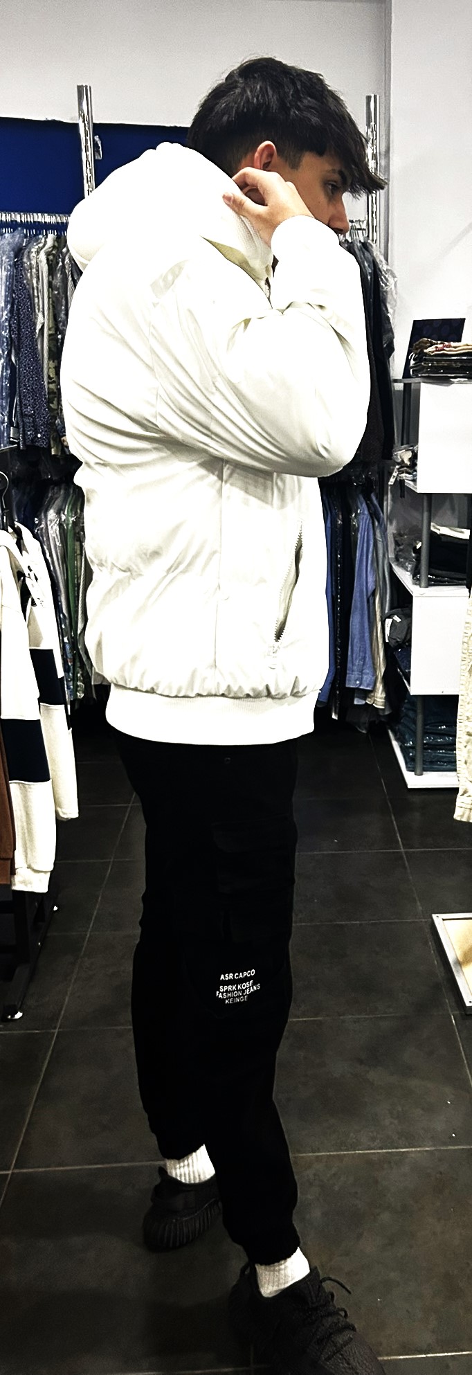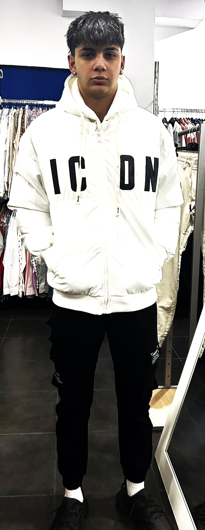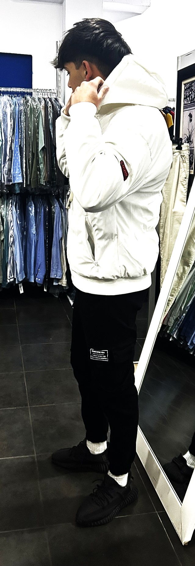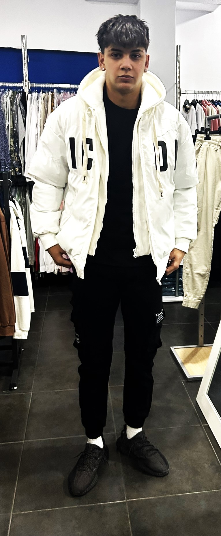 chaqueta tipo bomber, con capucha extraíble, color único blanco.