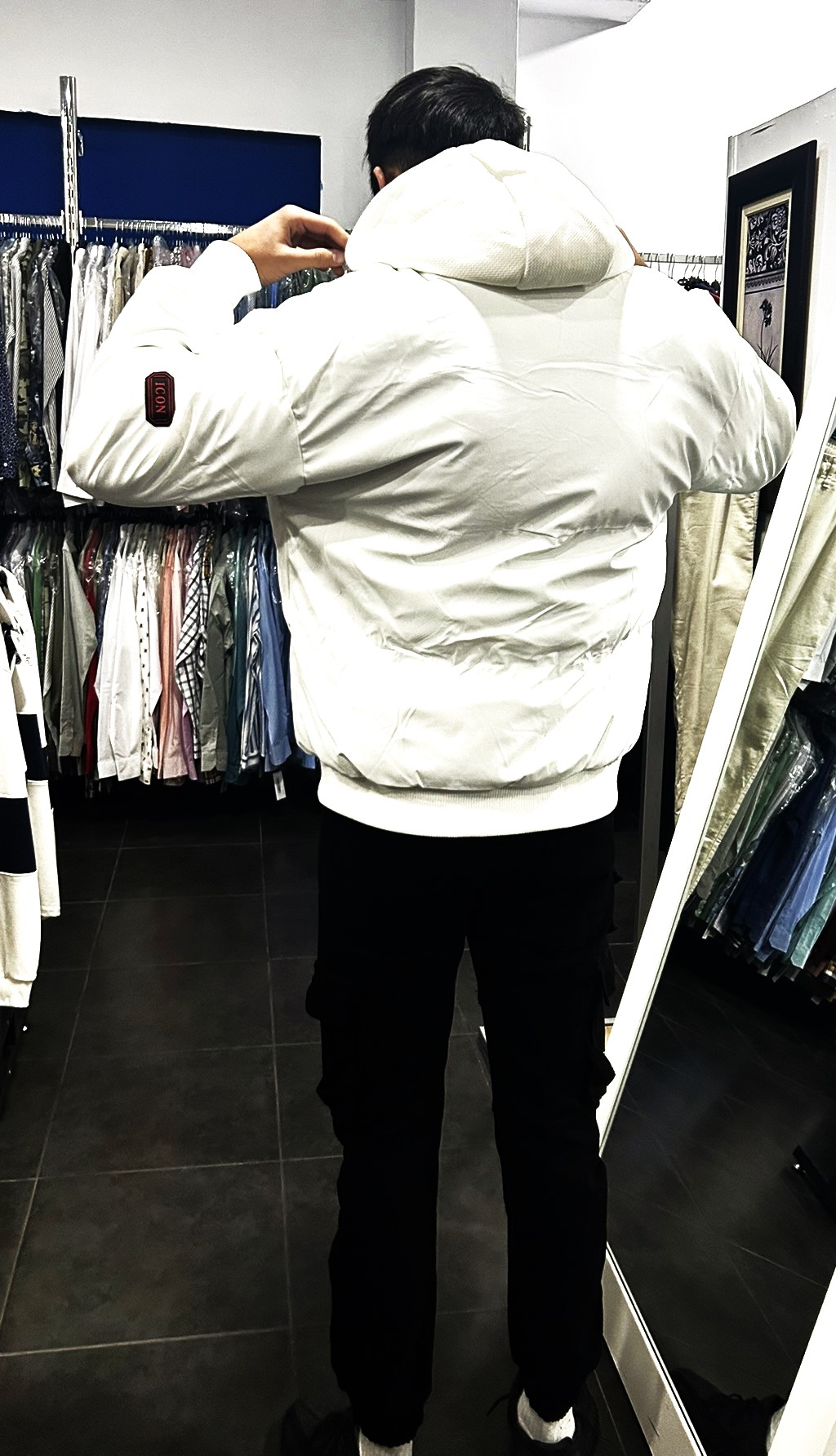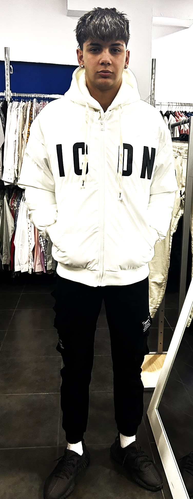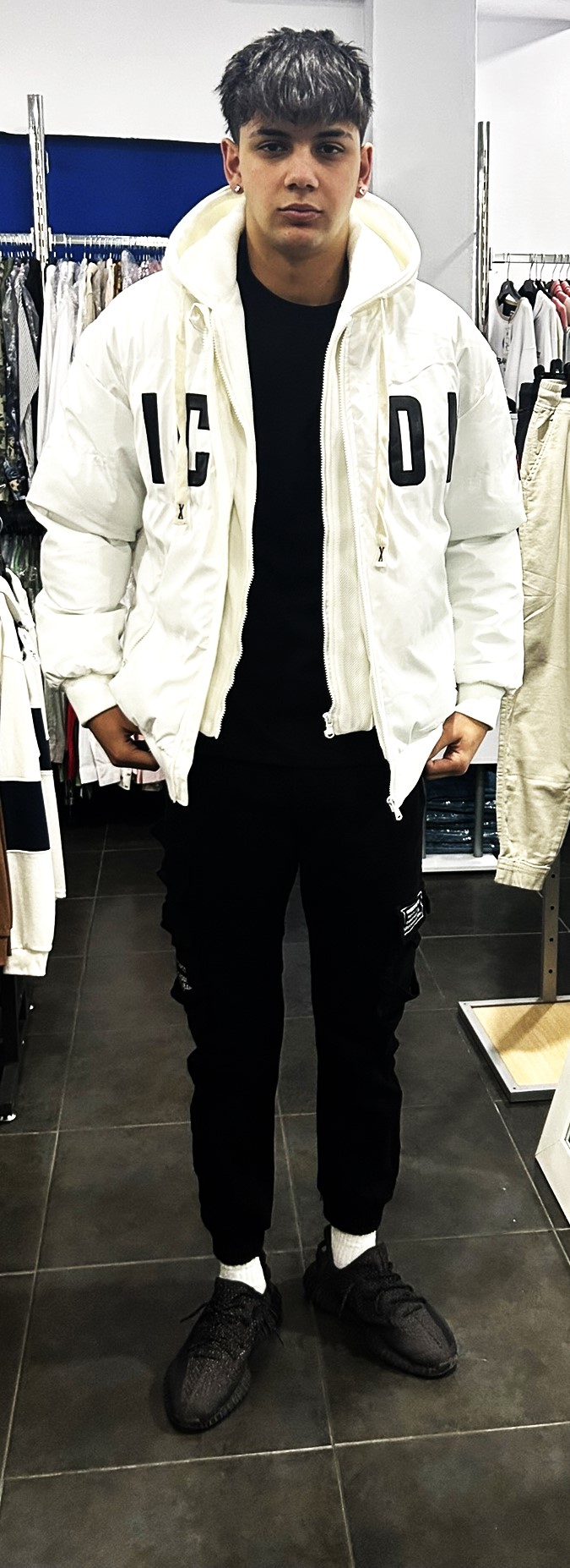 chaqueta tipo bomber, con capucha extraíble, color único blanco.