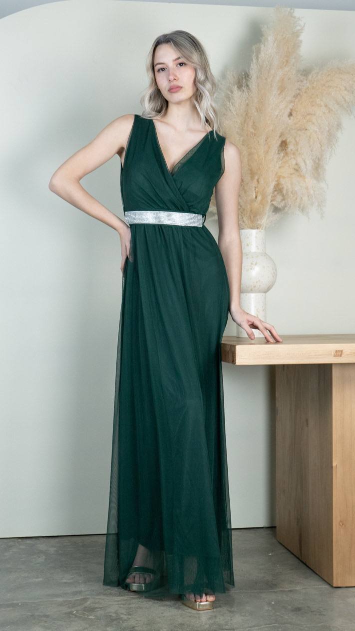 Vestido largo y forrado con apertura a un lado y una capa de tul con cinturón extraíble de pedrería y tirantes anchos. 75 % poliéster y 25% elastano. Disponible en varios colores.