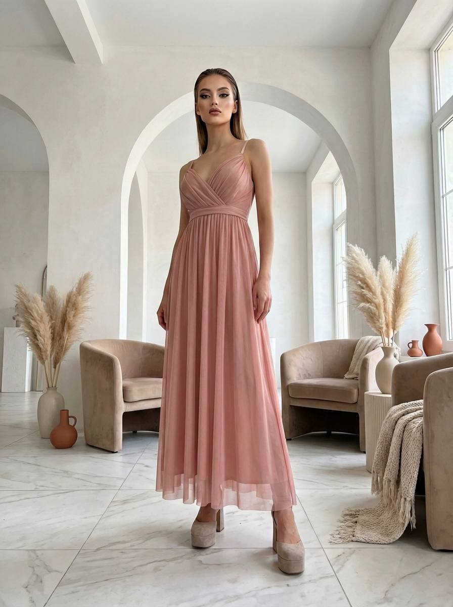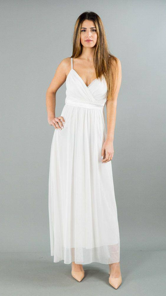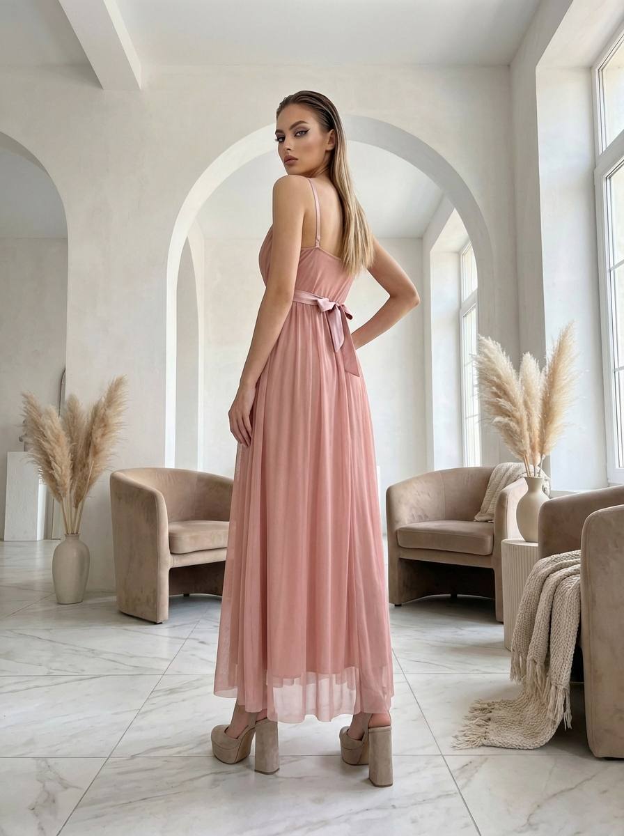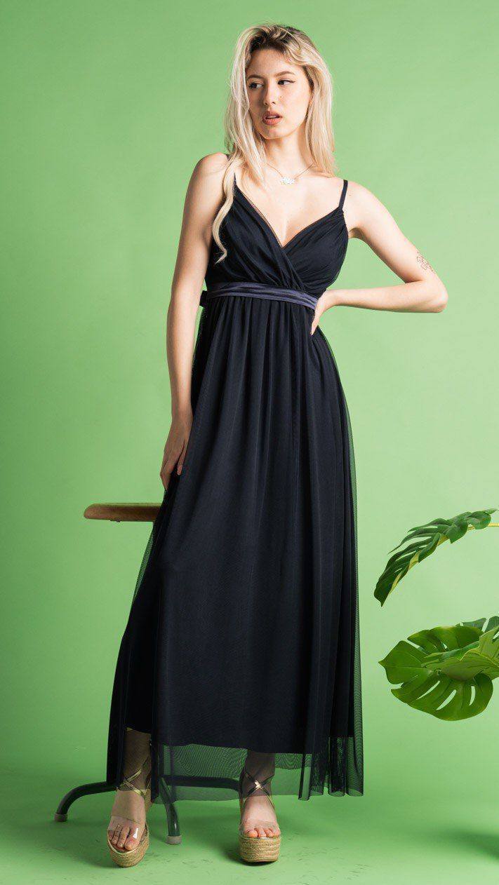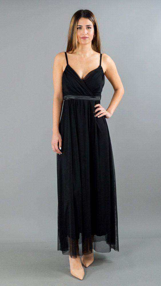 Vestido con tirantes ajustables con tul y cinta a la cintura que se puede quitar y poner. Composición 75% poliéster y 25% elastano. Disponible en varios colores.