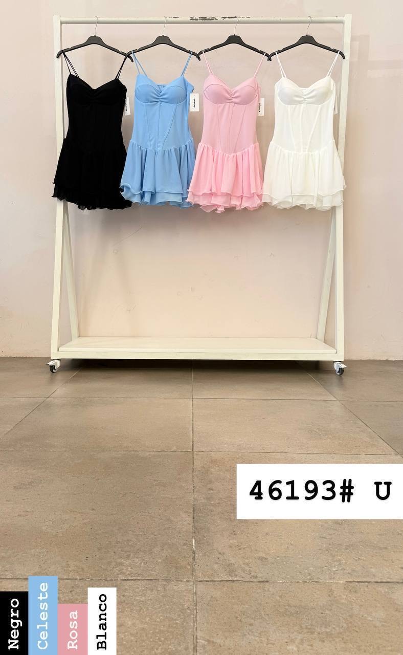 Vestido corto con volantes con fruncido en el pecho compuesto por 94% poliéster y 6% elastano. Disponible en varios colores.