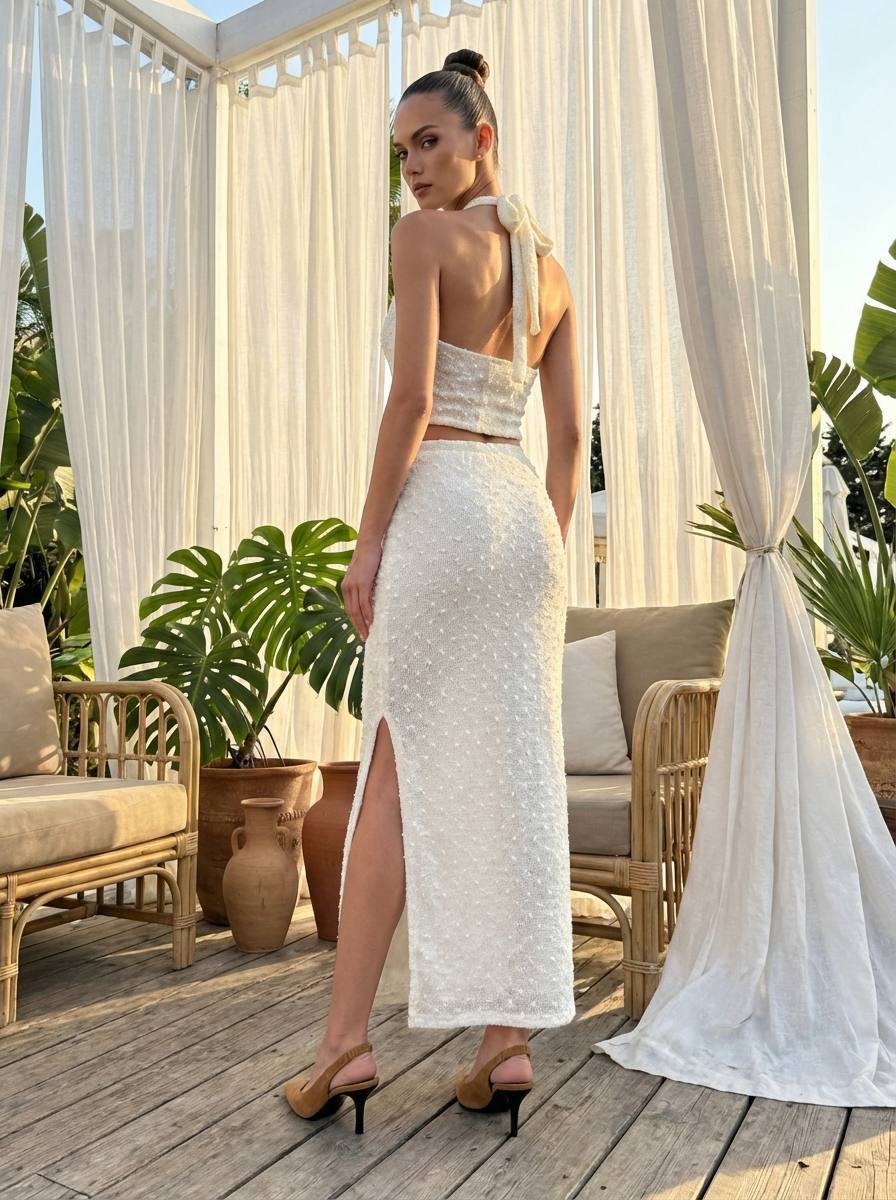 Falda larga en tela de encaje compuesta por 9% poliéster y 5% elastano. Forrada en 3/4. Disponible en varios colores.
