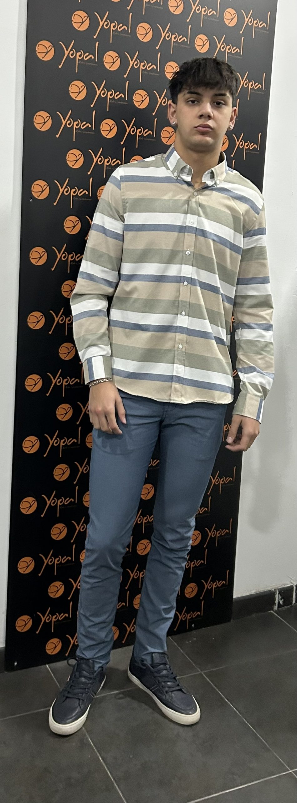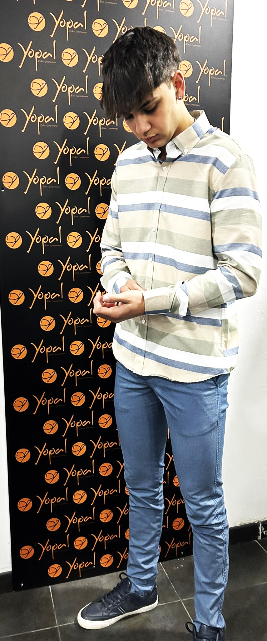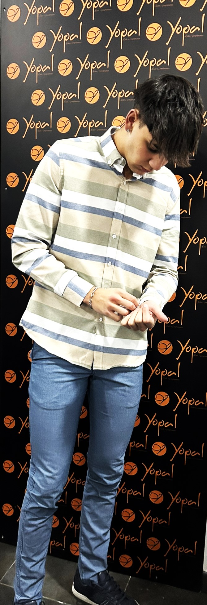 camisa de manga larga, estampado a franjas de colores azul, beig, blanco y verde